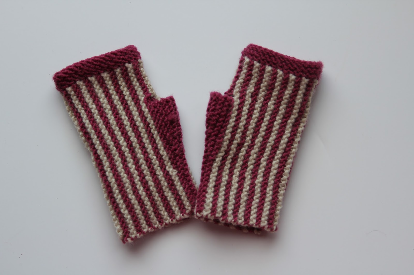 My second project is a pair of fingerless mitts, in small-kid size. For in-between weather, I've found that The Small Human's existing full-cover mittens were excessive, and difficult for her to fit over coat cuffs or take off herself. A pair of fingerless mitts would keep her hands warm, without getting in the way. Using scraps of Debbie Bliss Baby Cashmerino and Drops Baby Merino, I knit up a pair of striped garter stitch mitts, with short-row thumbs and applied edging. The Small Human is delighted to have her own pair of fingerless 'stripy colourwork' mitts (I think mostly because I wear fingerless stranded colour work